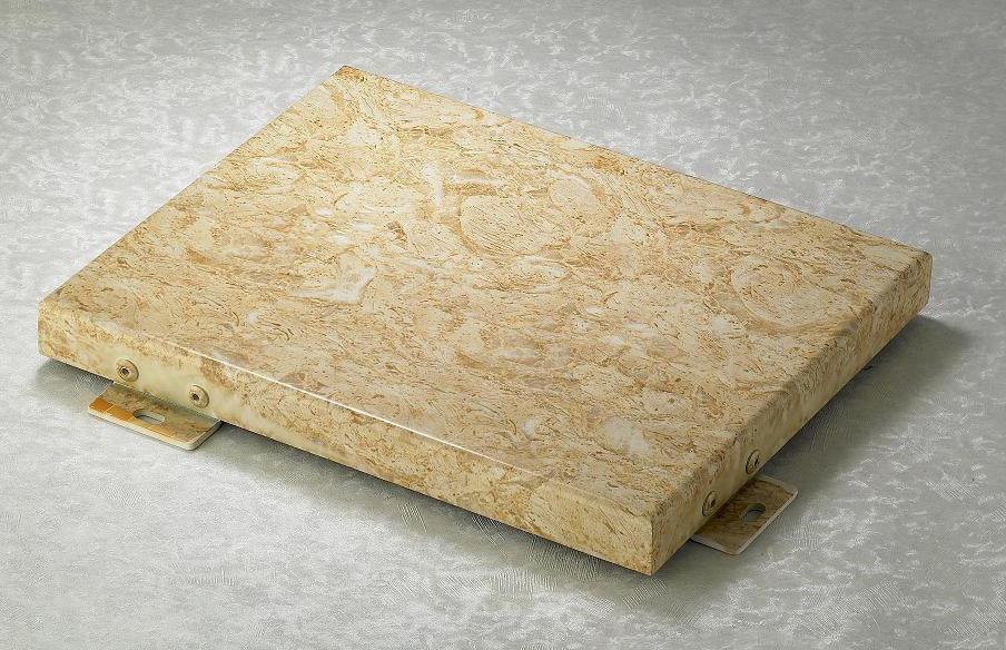 石纹铝单板采用高强度铝合金板材,经过数控折弯等技术成型,主要由面板、加强筋和角码组成。加强筋与板面后的电焊螺钉连接,使之成为一个牢固的整体,极大增强铝单板幕墙的强度与刚性,保证了长期使用中的平整性及抗震能力。